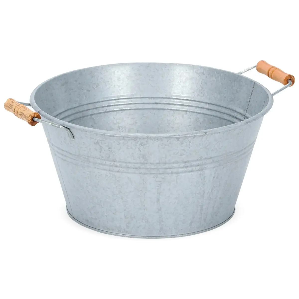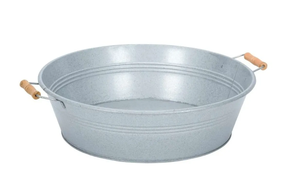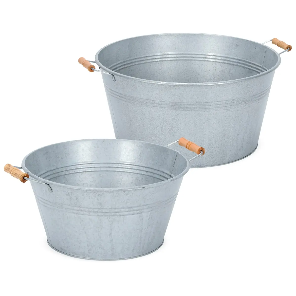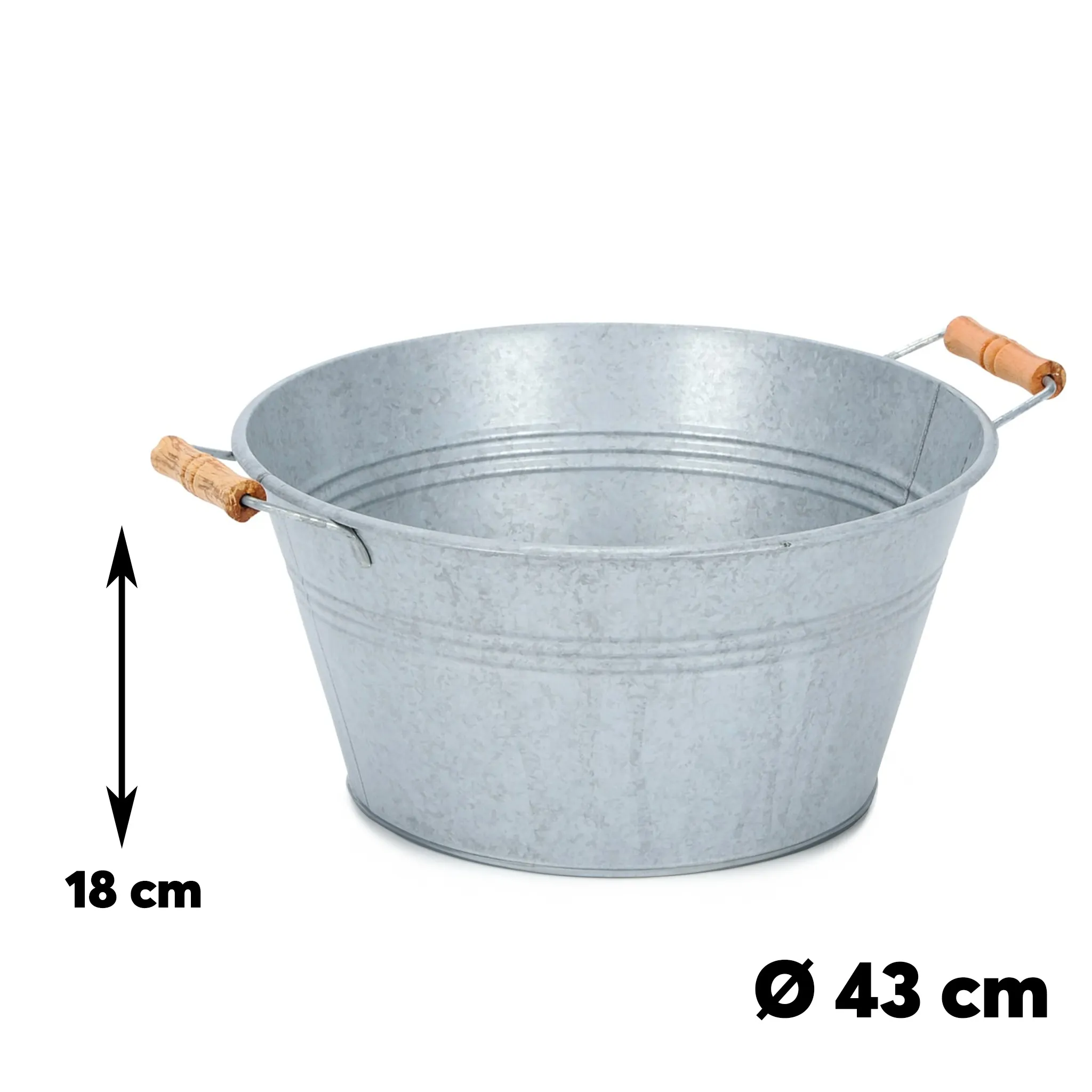 Die Wannen sind aus hochwertigem, verzinktem Metall gefertigt und in einem eleganten Silberton gehalten. Die stabilen Holzgriffe sorgen für einen komfortablen Transport und eine ansprechende Optik.