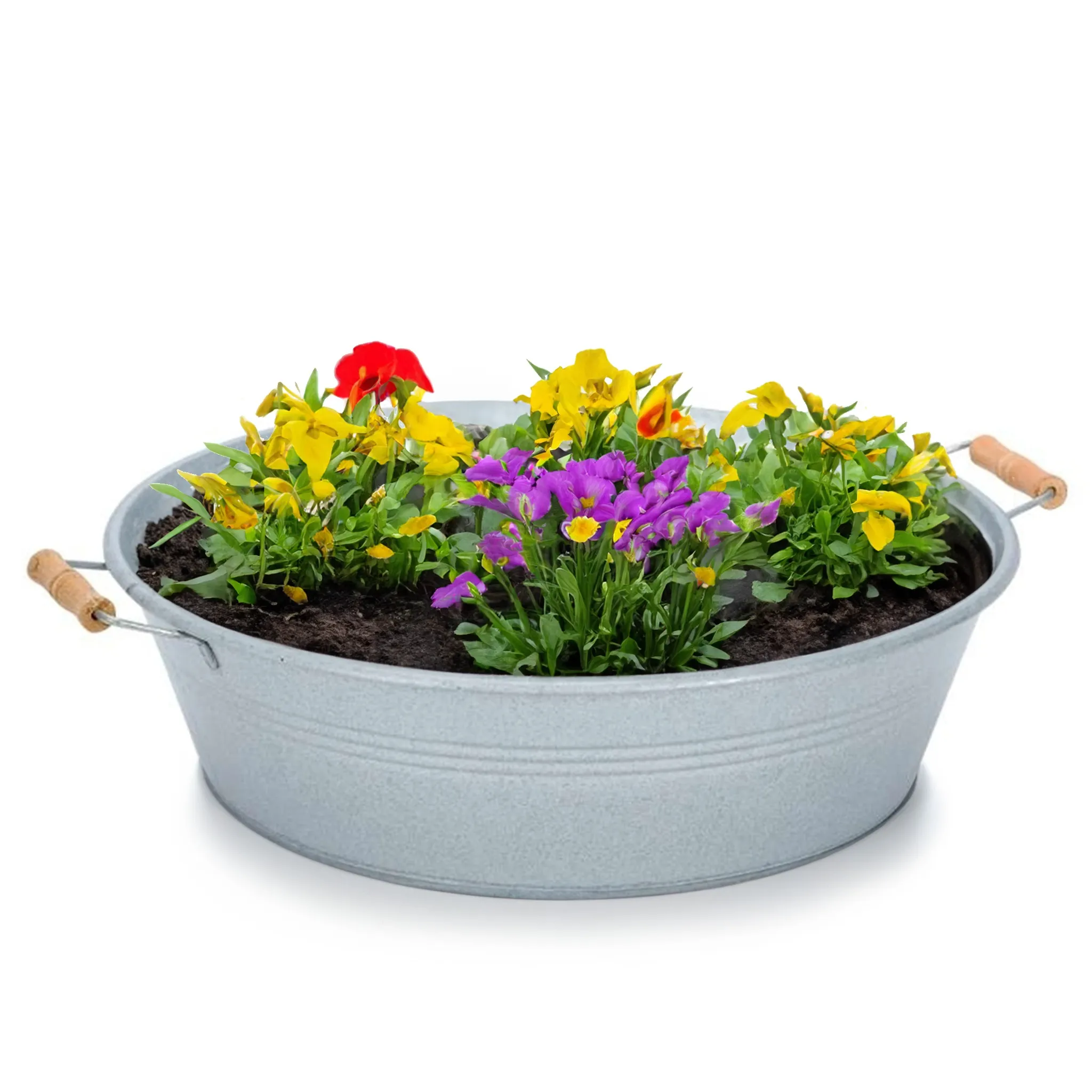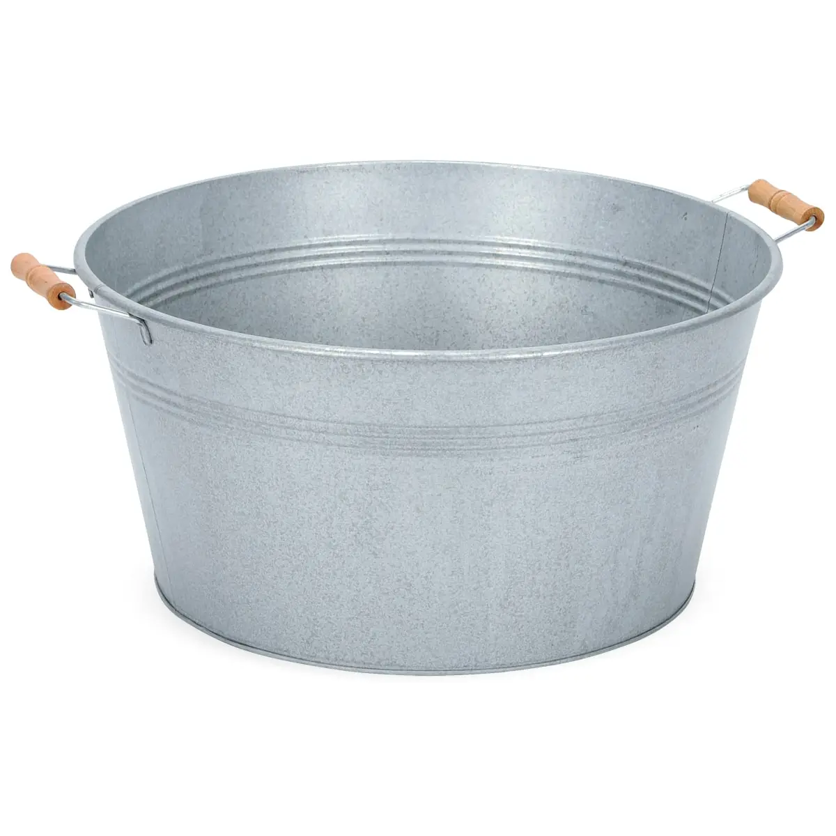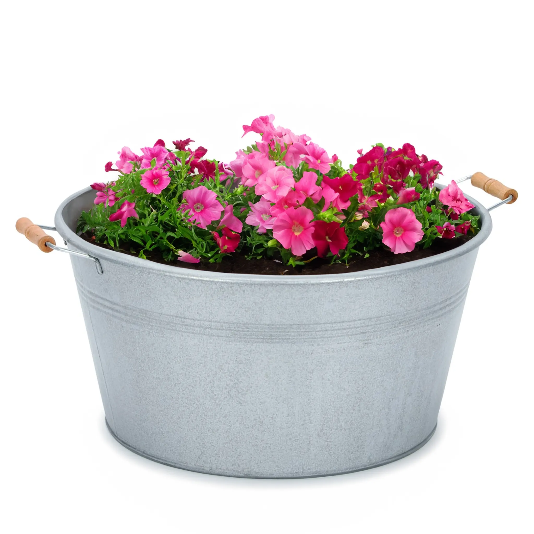 Die Wannen sind aus hochwertigem, verzinktem Metall gefertigt und in einem eleganten Silberton gehalten. Die stabilen Holzgriffe sorgen für einen komfortablen Transport und eine ansprechende Optik.
